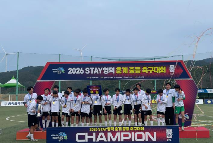 | 2026 STAY영덕 춘계 중등 축구대회 U14 백호그룹 우승을 축하하는 강구중 모습 |