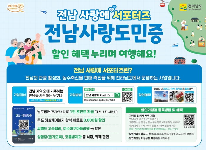 ‘전남 사랑애 서포터즈’는 전남 외 지역에 거주하면서 전남을 응원하고 방문하는 사람이라면 누구나 가입할 수 있는 참여형 정책이다. 가입자에게는 지역 주요 관광지, 숙박, 레저, 식당, 카페 등 940여 할인가맹점에서 혜택을 받을 수 있는 ‘전남사랑도민증’이 발급된다.