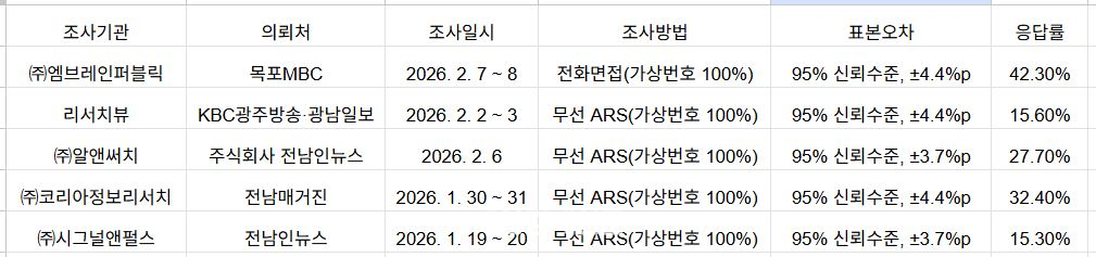 4앞선 KBC광주방송·광남일보(2/2~3 조사)의 다자대결 조사에서도 김신(22.8%), 신의준(20.5%), 지영배(16.4%) 후보가 선두 그룹을 형성했다. 당시 조사와 비교하면 신의준 후보의 지지율이 소폭 상승하고 김신 후보가 다소 조정받으며 순위가 뒤바뀌는 등 선두권 내 순위 싸움이 치열하다.