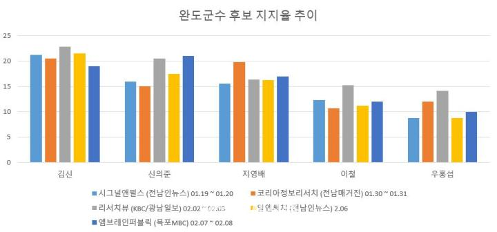 지난 1월 하순부터 2월 중순까지 진행된 네 차례의 여론조사(전남인뉴스, 전남매거진, KBC광주방송·광남일보, 목포MBC)를 종합하면, 상위권 후보들 간의 지지율 격차는 매우 촘촘하다.