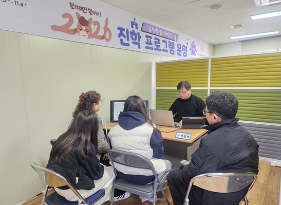 | 여수시가 마련한 ‘2026 예비 중3 맞춤형 1:1 진로·진학 컨설팅’에서 참여 학생과 학부모가 입시와 관련된 유익한 정보를 제공받고 있다. |