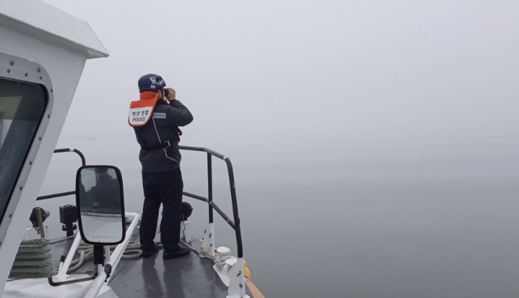 | 짙은 농무 속 해상 수색 중인 완도해경의 모습 |