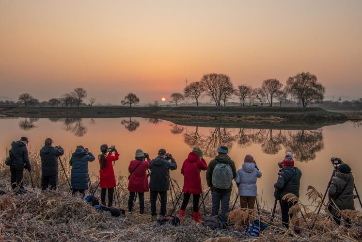 | 남도풍경연구소 소속 사진작가들이 동섬에서 떠오르는 해를 촬영하고 있는 모습.(사진 제공-나주시) |