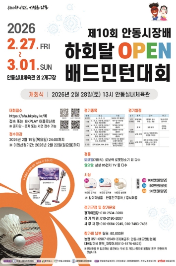안동시배드민턴협회가 주최․주관하는 이번 대회는 배드민턴의 생활체육 저변 확대와 지역경제 활성화를 목적으로 마련됐으며, 1,600여 명이 참가해 평소 갈고닦은 기량을 겨룰 예정이다.