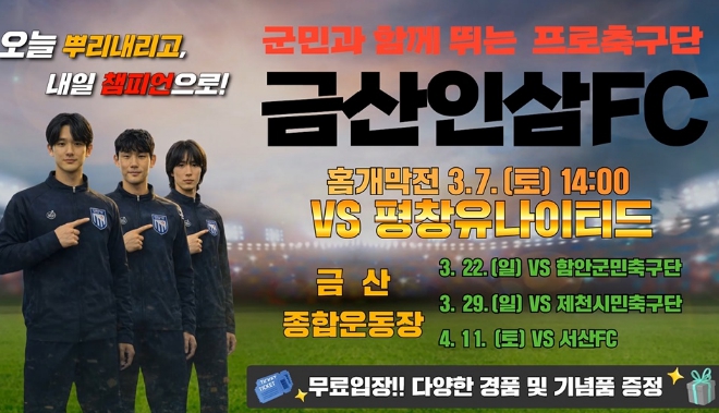 금산인삼 에프씨(FC) 관계자는 “이번 경기는 단순한 스포츠 행사를 넘어 지역 주민들이 하나로 뭉치는 축제가 될 것”이라며 “가족, 연인, 친구들과 부담 없이 경기장을 찾아 우리팀의 승리를 위해 함께 목소리를 높여주시길 바란다”고 말했다.