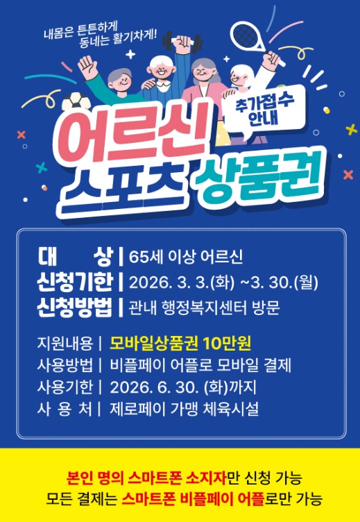 시 관계자는 “기존 사업 당시 어르신들의 참여 열기가 매우 높았고, 생활체육에 대한 관심과 수요를 확인할 수 있었다”며 “이번 추가 접수를 통해 더 많은 어르신들이 건강하고 활기찬 여가생활을 누리시길 바란다”고 말했다.