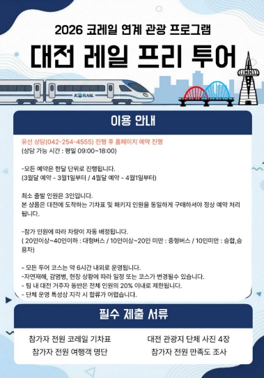 박승원 대전시 문화예술관광국장은“올해 코레일 연계 관광 프로그램은 참여객 수요(needs)와 세대별 여행 경향을 반영하여 새롭게 개편됐다”라며, “대전시를 찾는 관광객들이 편리하고 안전하게 대전 여행을 즐길 수 있길 바란다”라고 말했다.