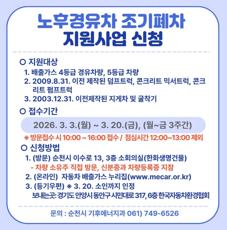 | 2026년 조기폐차 보조사업 20일까지 접수 |