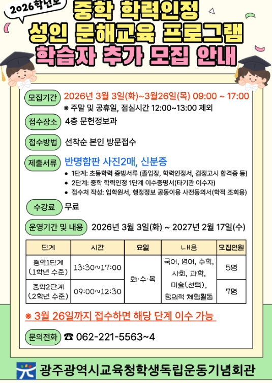 회관은 더 많은 시민에게 기회를 제공하기 위해 중학 학력인정 성인 문해교육 수강생을 추가로 모집한다.