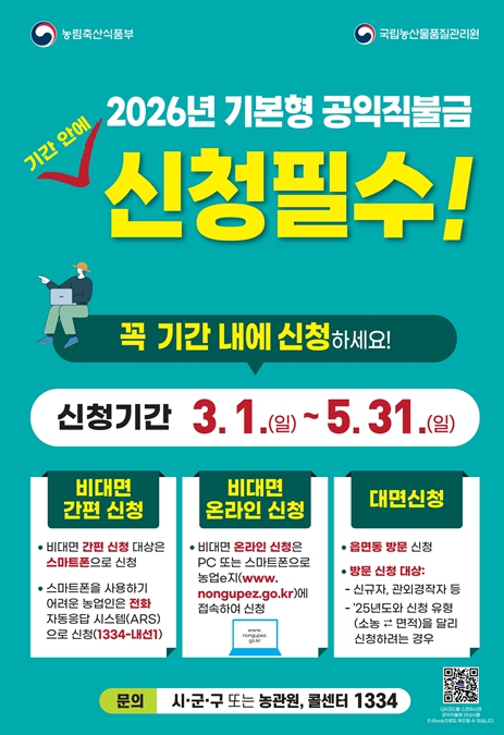 | 농업인 소득안정을 위한 기본형 공익직불금 신청 시작! |