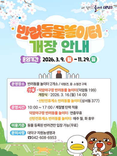 대덕구는 덕암야구장(덕암동 199)과 신탄진휴게소(상서동 377)에 반려동물 놀이터를 조성하고 3월 9일부터 운영에 들어간다고 밝혔다.