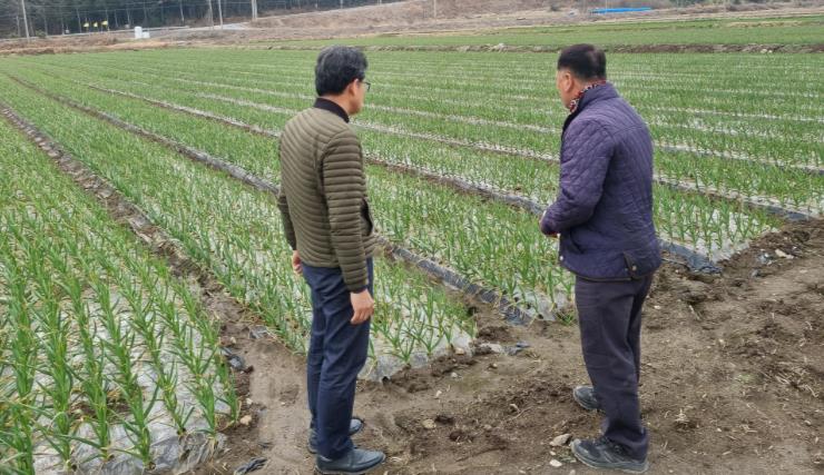 | 강진군 관계자가 강진관내 마늘농장을 방문했다. |