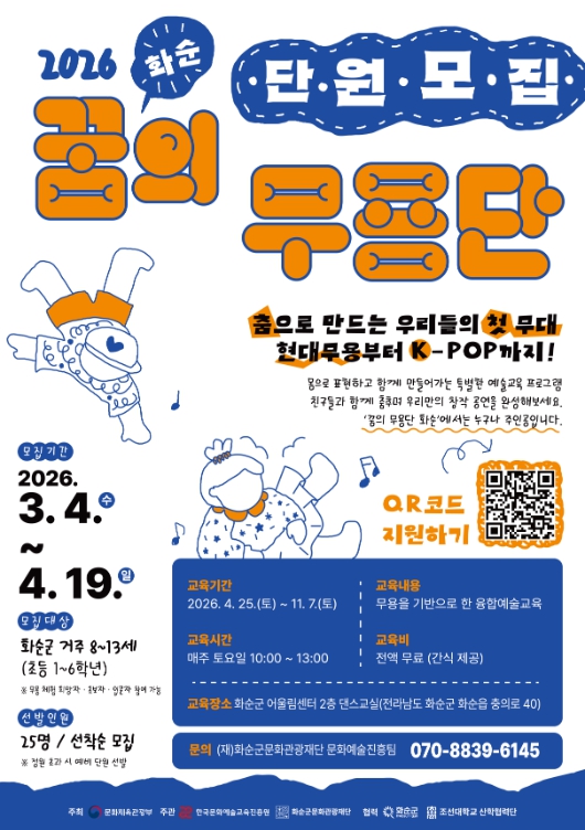 모집 관련 내용은 (재)화순군문화관광재단 누리집에서 확인할 수 있으며, QR코드 또는 온라인 신청 링크를 통해 접수하면 된다.