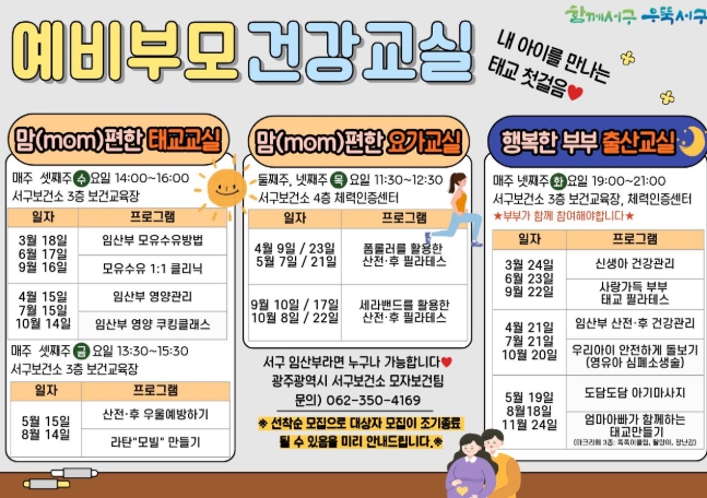 맞벌이 부부 등 주간 참여가 어려운 여건을 고려해 야간에도 프로그램을 운영한다. ‘행복한 부부 출산교실’은 월 1회 운영하며 부부가 함께 참여해 육아 지식을 습득하고 태아와 정서적으로 교감할 수 있도록 구성한다. 교육은 신생아 및 산욕기 건강관리 등 이론교육과 함께 부부 동반 만들기 활동, 신생아 응급대처 심폐소생술(CPR), 부부 필라테스 등 체험형 프로그램으로 구성해 예비부모의 실전 대응력을 높인다. 또한 임산부의 마음건강 관리 프로그램도 병행해 산전·산후 우울증 예방과 심리적 안정을 지원할 계획이다. 프로그램 참여 신청 등 자세한 사항은 서구보건소 모자보건팀(062-350-4139)로 문의하면 된다.