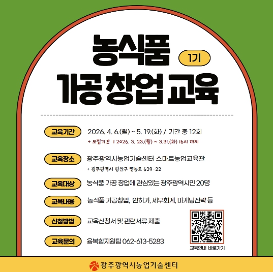 주요 교육 내용은 ▲농식품 가공기초 및 상품기획 ▲식품위생 및 인허가 절차 ▲식품 가공원리 및 제조 실습 ▲유통시장 분석 및 온·오프라인 마케팅 전략 등으로 창업에 필요한 이론과 실습을 균형 있게 구성했다.
