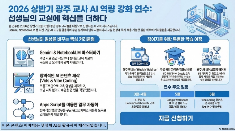 | [포스터] 광주시교육청, 생성형 AI 활용 ‘맞춤형 교원 연수’ 운영 |