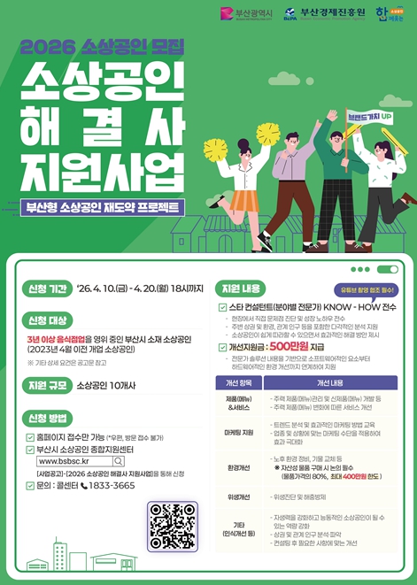 신청 대상은 3년 이상 음식점업을 영위하고 있는 부산 소재 소상공인이며, 참가 신청은 오늘(10일)부터 4월 20일까지 시 소상공인종합지원센터 누리집을 통해 할 수 있다.