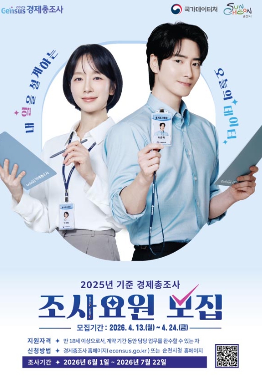 모집 공고는 경제총조사 홈페이지와 순천시 홈페이지를 통해 확인할 수 있으며, 24일까지 인터넷(경제총조사 홈페이지) 또는 순천시 디지털정책과로 방문 접수하면 된다.