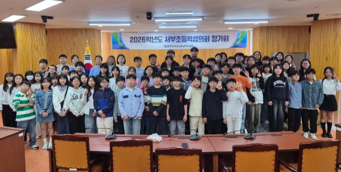 | 광주서부교육지원청이 15일 광주시교육청학생독립운동기념회관 학생의회실에서 ‘2026학년도 서부초등학생의회 제1차 정기회’를 개최해 의장단을 선출했다. /광주시교육청 제공 |