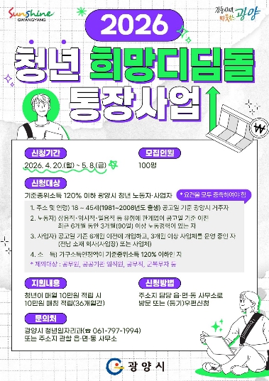 | 광양시, 2026년 ‘청년 희망디딤돌 통장사업’ 참여자 모집(홍보문) |