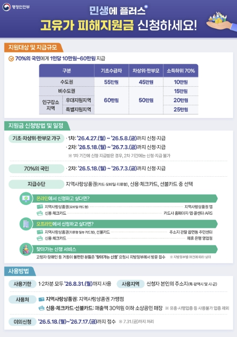 기초생활수급자는 60만 원, 차상위 계층 및 한부모 가족은 50만 원, 그 외 소득 하위 70%는 25만 원을 받는다.