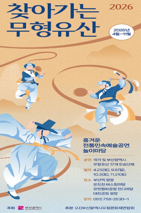 조유장 시 문화국장은 “이번 '2026 찾아가는 무형유산' 놀이마당은 우리 전통문화와 아름다움을 시민들과 함께 나눌 수 있는 의미 있는 시간이 될 것”이라며, “앞으로도 무형유산의 소중함을 알리는 다양한 민속 행사를 지속해서 개최할 계획으로, 시민 여러분들의 많은 관심을 부탁드린다”라고 전했다.