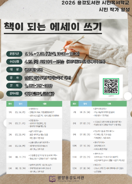 수강 신청은 4월 23일 오전 10시부터 시작되며, 글쓰기에 관심 있는 광양시민이면 누구나 참여할 수 있다.