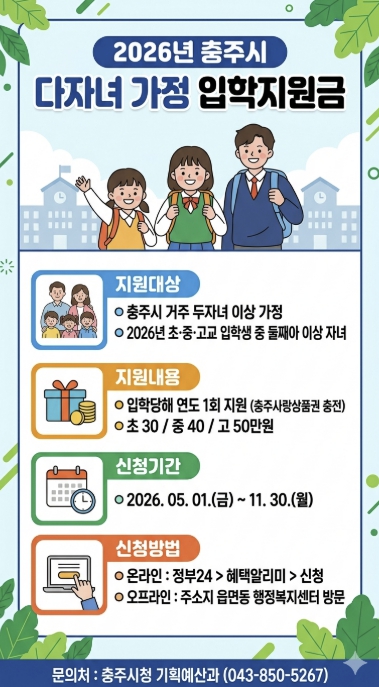 | 충주시, 다자녀 가정 ‘둘째부터’ 입학지원금 지급… 최대 50만 원 |