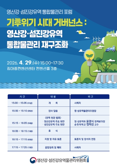 포럼에는 영산강유역환경청, 영산강홍수통제소, 한국환경연구원, 학계, 시민단체 등 물관리 분야 전문가와 이해관계자 약 70여 명이 참석해 기후위기 시대에 대응하기 위한 영산강ㆍ섬진강유역 통합물관리 재구조화 방안을 심도 있게 논의할 예정이다.