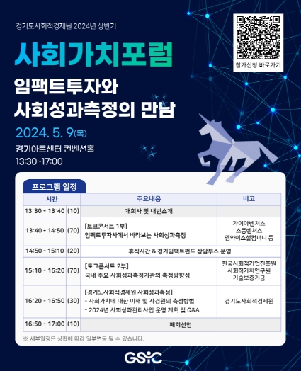 ‘사회가치측정과 임팩트투자(사회 및 환경에 긍정적 영향을 미치는 사업·기업에 투자하는 형태)의 만남’을 주제로 개최되는 이번 포럼은 사회성과에 대한 이해를 바탕으로 사회성과 측정의 방법과 관리, 중요성에 대해 논하는 토크 콘서트 형식으로 마련됐다. 또한 참가자는 현장에 마련된 경기임팩트펀드 상담부스를 방문해 투자 상담도 받을 수 있다.
