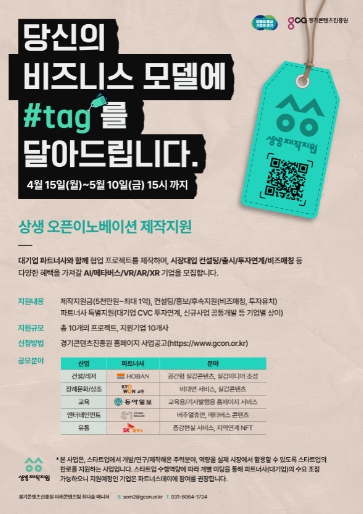 신청은 5월 10일까지 경기콘텐츠진흥원 누리집 및 전자우편을 통해 가능하며, 자세한 사항은 경기콘텐츠진흥원 사업공고를 참고하거나 경기콘텐츠진흥원 미래콘텐츠팀으로 문의하면 된다.
