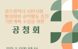 전국 박철홍 기자2025. 09.22[제일경제신문]광주광역시는 23일 오후 4시 광주광역시의회 5층 예결위회의실에서 ‘광주광역시 시민사회 활성화와 공익활동 증진을 위한 기본계획(제1차, 2026~2028)’ 최종보고회 겸 공청회를 개최한다. 광주시가 주최하고 광주시민사회지원센터가 주관하는 이번 공청회는 향후 3년간 광주 시민사회의 지속가능한 발전을 위한 정책방향을 최종 확정하기 전 시민사회 현장의 의견을 수렴하기 위해 마련됐다. 광주시는 2023년 ‘광주광역시 시민사회 활성화와 공익활동 증진 조례’를 제정하고, 2024년 7월 기존 ‘광주NGO지원센터’를 ‘광주시...