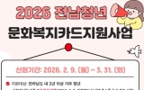 전국 박철홍 기자2026. 03.12[제일경제신문]무안군은 청년의 문화생활과 자기계발을 지원하기 위해 ‘2026년 전남 청년 문화복지카드 지원사업’ 대상자를 모집하고 있다고 밝혔다. 올 2월 한 달간 접수 결과 방문 신청 170건, 온라인 신청 2,075건 등 총 2,245건이 접수됐으며, 군은 아직 신청하지 못한 청년들이 지원을 받을 수 있도록 3월 말까지 추가 접수를 진행할 예정이다. 지원 대상은 2024년 2월 9일 이전부터 전라남도에 주소를 두고 무안군에 2년 이상 거주한 19세부터 28세까지(1998~2007년 출생) 청년이다. 대상자로 선정되면 1인...