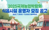 전국 박철홍 기자2025. 08.04[제일경제신문](재)전라남도국제농업박람회는 2025 국제농업박람회 식음시설 운영자를 오는 13일까지 3주간 모집한다고 밝혔다. 이번 모집은 주제전시관인 농업미래관 옆 뷔페관(288석·600㎡)과 행사장 내 푸드트럭을 대상으로 진행한다. 전남·광주지역 주소를 두고 해당 업종을 정상적으로 운영 중인 업체면 신청할 수 있다. 자세한 내용은 국제농업박람회 누리집의 공고문에서 확인할 수 있으며, 궁금한 사항은 국제농업박람회 행사운영팀으로 문의하면 된다. 박관수 전남도국제농업박람회 사무국장은 “성공적 행사를 위해서는 먹거리가 매우 중...