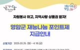 전국 박철홍 기자2025. 03.31[제일경제신문]영암군자원봉사센터가, 4/18일까지 ‘2025년도 재능 나눔 포인트’ 신청을 받는다. 자원봉사 활동 지지, 지역경제 활성화 등을 취지로 한 재능 나눔 포인트를 받을 이들은, 총 122명으로 ‘1365자원봉사포털’ 기준 지난해 50시간 이상 봉사자들이다. 포인트 신청은 ‘재능기부 영암나눔e’ 홈페이지에서 할 수 있고, 인정 봉사 시간에 따라 영암군은 5~15만원의 지역사랑상품권을 제공할 예정이다. 포인트를 받을 봉사자에게 안내 문자를 발송한 영암군은, 온라인 신청자에게는 ‘월출페이’ 앱으로 지역사랑상품권을 지급...