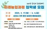 전국 박철홍 기자2025. 03.31[제일경제신문]순천시는 오는 4월 4일까지 2025년 농업인대학 미래농업과정 입학생을 모집한다고 밝혔다. 2025년 순천시 농업인대학 미래농업과정은 4월 24일 입학식을 시작으로 10월 30일까지 스마트농업 기술교육 및 아열대 재배기술 교육을 21회(83시간) 실시한다. 올해는 국립순천대학교와 협의하여 농업과학교육원 스마트팜 실습교육장에서 파종, 육묘, 착과량 조절, 수확 등 스마트팜 실습교육을 통해 실질적인 미래농업기술을 배울 수 있는 기회를 제공할 계획이다. 아열대 재배기술 강의는 국립원예특작과학원 온난화대응연구소의 문두...