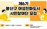 전국 박철홍 기자2025. 03.28[제일경제신문]광주 광산구가 제6기 광산구 여성친화도시 시민참여단을 모집한다. 여성친화도시 시민참여단은 성평등 정책 및 생활환경 개선 사업 등 여성친화도시 사업을 추진하고 정책을 제안하는 역할을 한다. 이번 6기는 △교육·워크숍 통한 역량 강화 △일·가정 균형 문화 조성 캠페인 △안전취약지역 발굴 △마을돌봄공동체 및 가족친화환경 조성 사업 홍보 △광산구 여성친화사업 및 정책 홍보 등 다양한 활동을 펼친다. 또한 광산경찰서와 협력해 공중화장실 불법카메라 탐지 및 여성안심귀갓길 점검 등 안전 모니터링과 성범죄 취약 지역을 집중 점...