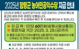 전국 박철홍 기자2025. 03.16[제일경제신문]전남 함평군이 지역 농어민의 농업 활동을 장려하기 위해 농가당 60만원 상당의 농어민 공익수당 지급을 시작했다. 함평군은 16일 “농어민 공익수당 중점 지급이 지난 14일부터 시작됐으며 28일까지 대상 농어민들은 관할 지역농협에서 수령할 수 있다”고 밝혔다. 앞서, 함평군은 1월 16일부터 2월 7일까지 농어민 공익수당 신청을 받았으며 3월 7일 심의 위원회 거쳐 총 8,199명 중 적격자 7,801명을 지급대상자로 선정했다. 이번 농어민 공익수당은 신분증을 지참해 본인이 직접 수령해야 한다. 단, 질병이나 부상...