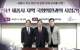 연예 김정란 기자2025. 02.25[제일경제신문]최민호 세종특별자치시장과 지역 국회의원인 김종민·강준현 의원이 25일 서울 국회의원회관에서 만나 개헌을 통한 행정수도 완성과 세종시 현안에 함께 힘을 모으기로 다짐했다. 이날 간담회에서는 최민호 시장과 지역 국회의원은 물론 임채성 시의회 의장, 시의원, 주요 실·국장이 모두 참여해 행정수도 완성 등 시정 주요 현안과 핵심 당면 과제를 논의했다. 주요 실·국장은 직접 ▲대통령집무실·국회세종의사당 등 행정수도 완성 방안 ▲정부 추경에 대비한 국비지원 과제 및 주요 사업 협력안 ▲올해 세종시 주요 업무계획·핵심 추진과제...