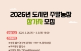 전국 박철홍 기자2026. 02.23[제일경제신문]광양시는 도심 속에서 농업을 체험하며 가족과 함께 건강한 여가를 보낼 수 있는 ‘2026년 도시민 주말농장’ 참가자를 2월 26일부터 3월 5일까지 모집한다고 밝혔다. 도시민 주말농장은 시민이 일정 구획의 텃밭을 분양받아 직접 작물을 재배하는 체험형 농업 프로그램으로, 농업에 대한 이해를 높이고 건강한 먹거리의 가치를 체험할 수 있도록 매년 운영되고 있다. 신청 대상은 공고일 이전 주민등록상 주소지가 광양시인 시민이며, 참가비는 1만 원이다. 올해는 ▲일반텃밭 90구획 ▲은퇴자텃밭 20구획 ▲다자녀가정 텃밭 20구...
