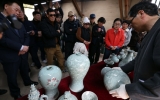 정치 김정란 기자2026. 02.22[제일경제신문]1300˚C를 견딘 청자의 빛은 영롱하기만 하다. ‘흙과 불 그리고 사람의 이야기’를 주제로 열리고 있는 제54회 강진청자축제. 지난 22일 강진군 대구면 고려청자박물관 제2호가마에서 화목가마 요출행사가 열린 가운데 옛 전통방식 그대로 소나무 장작을 이용해 48시간 동안 구워낸 청자를 꺼내고 있다.