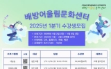 사회이슈 김정란 기자2025. 01.06[제일경제신문]아산시 배방어울림문화센터에서 ‘2025년 제1분기 프로그램’ 수강생을 모집한다. 모집 부분은 시낭송, 오일파스텔, 인물화 등 총 10개 과정으로 아산시민을 대상으로 9일까지 선착순 모집한다. 운영 기간은 1월부터 3월까지다. 수강신청 관련 문의는 배방어울림문화센터 전화(548-5558) 또는 포스터 QR코드로 가능하다.