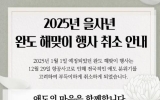전국 박철홍 기자2024. 12.30[제일경제신문]완도군은 2025년 1월 1일 신지 명사십리 이벤트광장 일원에서 예정되었던 ‘2025 을사년 완도 해맞이 행사’를 전면 취소한다고 밝혔다. 12월 29일 발생한 무안공항 항공기 사고에 따른 전국적인 애도 분위기를 고려하고 유가족을 배려하기 위해 해맞이 프로그램과 행사를 취소하기로 결정했다. 해맞이 행사는 취소됐지만 신지 명사십리 이벤트 광장을 찾는 방문객들을 위해 안전요원들을 배치할 계획이다. 신우철 완도군수는 “항공기 사고에 따른 탑승객분들과 유가족분들에게 깊은 애도와 위로의 마음을 표한다”라며 “해맞이...