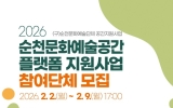 전국 박철홍 기자2026. 01.28[제일경제신문](재)순천문화재단은 오는 2월 2일부터 9일까지 지역 문화예술단체의 안정적인 활동 기반을 마련하고, 문화예술 공간을 지역 문화예술 생태계의 거점으로 육성하기 위해 ‘2026 순천문화예술공간 플랫폼 지원사업’에 참여할 문화예술단체를 모집한다. ‘순천문화예술공간 플랫폼 지원사업’은 기존의 임차료 보전 중심 지원 방식에서 벗어나, 문화예술단체의 공간을 예술활동과 예술인간 교류, 시민과의 성과 공유가 유기적으로 이루어지는 공간 기반 문화예술 플랫폼으로 전환하는 데 목적을 두고 있다. 지원 대상은 순천시에서 활동 중인 문...