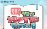전국 박철홍 기자2026. 01.20[제일경제신문]해남군교육재단은 군민 평생학습 환경 조성을 위해 상반기 땅끝누리 늘찬배달강좌 학습자를 모집한다. 상반기 땅끝누리 늘찬배달강좌는 3월 3일부터 6월 19일까지 총 16주간 운영되며, 기간 중 총 13회 강좌로 구성된다. 운영 대상은 원칙적으로 10인 이상으로 구성된 학습팀이며, 악기를 활용한 강좌에 한해 7인 이상으로 구성된 학습팀도 신청 가능하도록 운영 기준을 적용한다. 모집 규모는 총 135팀 내외다. 특히 올해 상반기에는 기존 ‘1인 1강좌 신청’에서 동일한 학습팀원이 구성되는 조건하에 1인당 최대 2개 ...