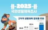 전국 박철홍 기자2026. 01.19[제일경제신문]문화체육관광부는 만 10세 이상인 국민 9천 명을 대상으로 시행한 ‘2025년 국민생활체육조사’ 결과를 발표했다. 2025년 생활체육 참여율(주 1회, 30분 이상)은 62.9%로, 전년 대비 2.2%포인트(p) 상승했다. 특히 주 2회 이상 참여율은 52.2%로 2.7%포인트(p) 증가했다. 연령대별로는 20대부터 60대까지의 참여율은 65% 내외로 비교적 고르게 나타났으나, 10대(43.2%)와 70대 이상(59.5%)은 다른 연령대에 비해 낮은 수준을 보였다. 주요 참여 종목은 걷기(40.5%), 보디...