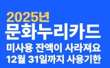전국 박철홍 기자2025. 12.07[제일경제신문]광주문화재단은 2025년 문화누리카드 사용기한이 12월 31일까지이며, 미사용 지원금은 자동 소멸한다고 밝혔다. 특히 연말까지 3만 원 이상 사용하지 않을 경우, 내년 자동 재충전 대상에서 제외될 수 있어 이용자의 주의가 필요하다. 올해 문화누리카드 지원금은 1인당 14만 원으로, 도서·영화·공연·테마파크·시외버스·KTX·체육시설·스포츠 용품·스포츠 관람·캠핑용품 등 다양한 분야에서 사용할 수 있다. 문화누리카드는 지역 축제에서도 활용할 수 있다. 올해 마지막 연계 축제인 ‘빛고을 사랑나눔 김장대전’에서는 김장체...