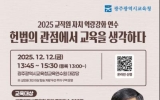 전국 박철홍 기자2025. 12.02[제일경제신문]광주시교육청은 오는 12일 오후 1시45분부터 광주시교육청교육연수원 대강당에서 문형배 전 헌법재판관을 초빙해 ‘교직원 자치 역량 강화 연수’를 개최한다. 이번 연수는 시교육청의 ‘헌법과 민주주의 수호 기간’을 맞아 헌법적 가치에 기반한 민주적 학교 자치 실현을 위해 마련됐다. 문 전 재판관은 ‘헌법의 관점에서 교육을 생각하다’라는 주제로 민주적 교육 현장에서 요구되는 자율성·책임성·민주성의 의미를 소개할 예정이다. 시교육청은 이날 연수에 앞서 헌법 수호의 의미를 다지기 위한 ‘헌법 조항 쓰기 릴레이...