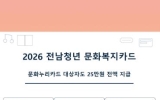 전국 박철홍 기자2025. 11.18[제일경제신문]전라남도는 2026년부터 전남 청년 문화복지카드 사업 추진 시 경제적 취약 계층(기초생활수급자·차상위계층)이 수혜를 받는 문화누리카드 지급자에게도 25만 원 전액을 지급한다고 밝혔다. 전남청년 문화복지카드는 청년의 문화 향유 기회를 넓히고 자기 계발을 돕기 위해 2022년부터 시행하고 있다. 전국 최초로 소득 기준 없이 청년에게 문화복지비를 10년간 최대 250만 원을 지원한다. 이를 통해 청년은 공연 관람, 학원 수강, 도서 구입, 체육시설 이용 등 다양한 문화·복지 혜택을 받을 수 있다. 기존 전남청년 ...